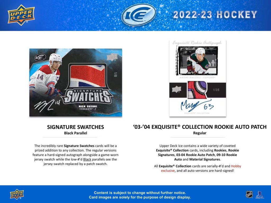 Hľadajte Rookie karty tých najlepších nováčikov sezóny 2022-23 a to na veľmi unikátnych a najžiadanejších kartách ICE PREMIERES, ICE PREMIERES AUTO, ICE PREMIERES AUTO PATCHči EXQUISITE COLLECTION!