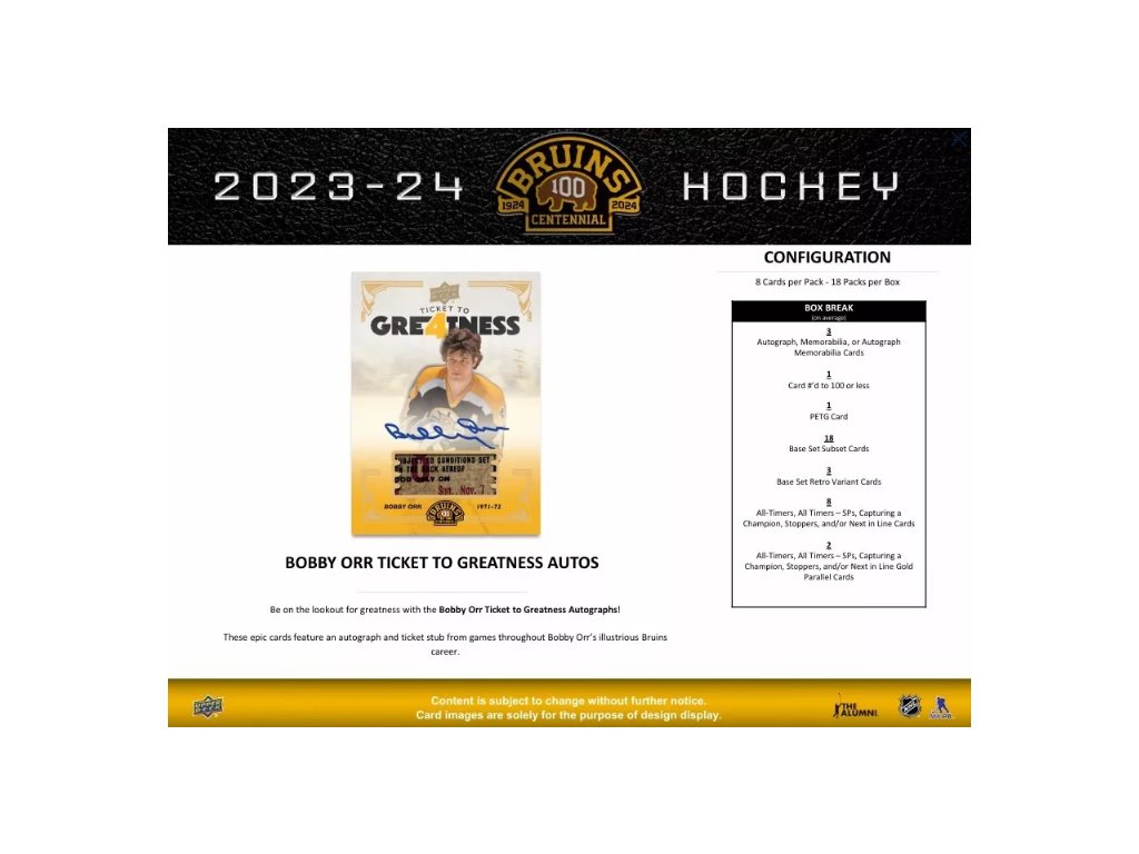 Tým úplne najväčším lákadlom v sérii sú ale karty, ktoré zobrazujú veľkosť Bobbyho Orra, jedného z najlepších obrancov histórie NHL - Bobby Orr Ticket to Greatness Autographs! Tieto epické karty, všetky v limitácii 1/1, obsahujú jeho Hard Signed podpis a útržok vstupenky zo zápasov počas slávnej kariéry tejto legendy v drese Bruins!
