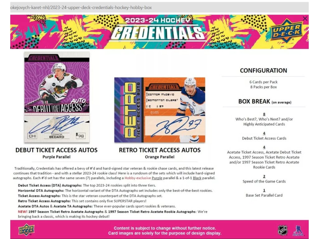Nové Upper Deck Credentials sa snaží získať priazeň zberateľov veľmi nevšedným, moderným dizajnom, ktorý môže osloviť široké spektrum zákazníkov. V kombinácii s množstvom Hard Signed podpisov môžu byť Credentials príjemným prekvapením sezóny 23-24! , Ktorý obsahuje 100 radových kariet a 100 limitovaných rookie kariet Debut Ticket Access, ktoré sú rozdelené do 4 úrovní (Level 1 až 4).