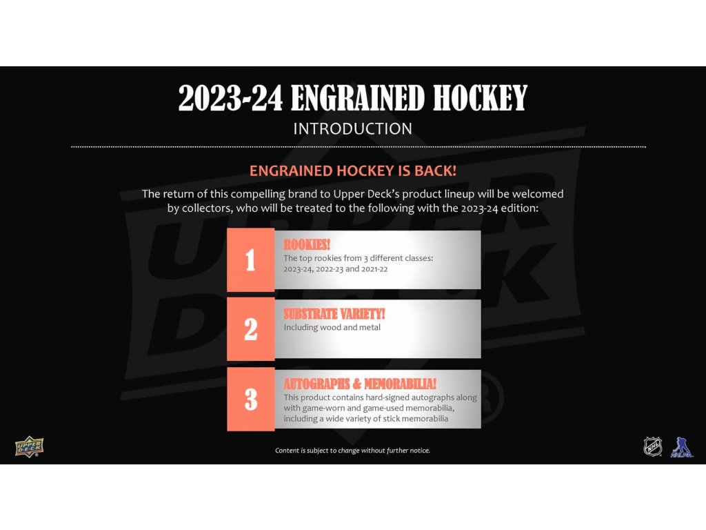 Engrained sú dobre známe tiež pre stick&memorandum karty a edície 2023-24 nie je výnimkou - tu zoznam kariet, ktoré obsahujú kúsky hokejok: