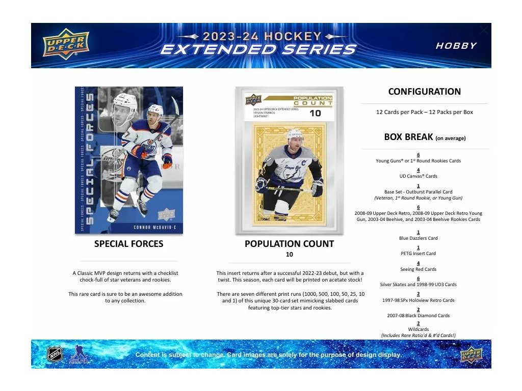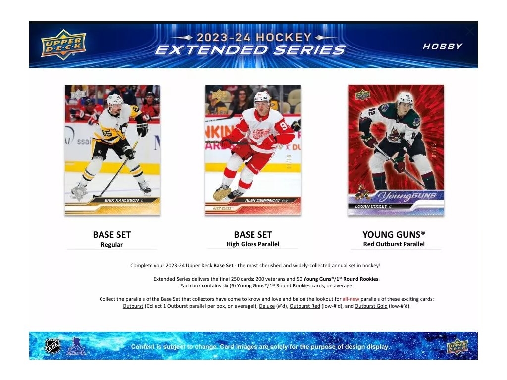 - 200 radových kariet, ďalších 30 Young Guns, plus 20 kariet 1st Round Rookies (2023-24 nováčikovia vybraní v prvom kole draftu NHL).