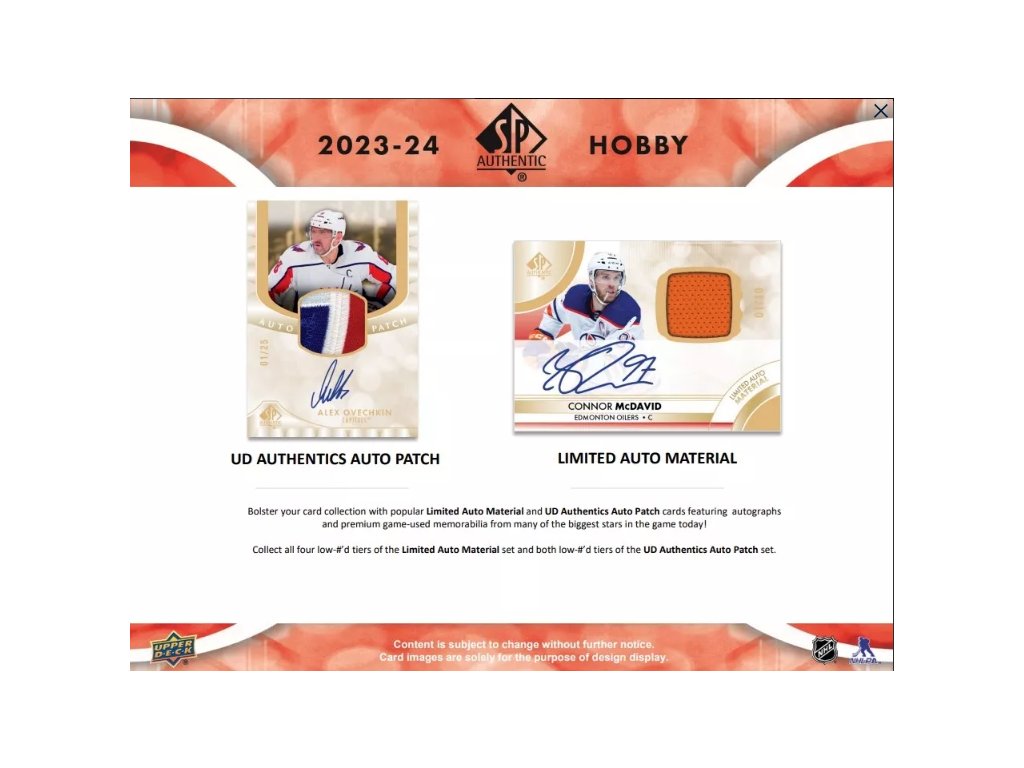 V sérii nechýbajú ani veľmi populárne karty Limited Auto Material a UD Authentics Auto Patch, ktoré tiež obsahujú obvykle krásne kúsky memorabílií vo forme patch a hard signed podpis. V sete len tie najlepšie mená súčasnej NHL! Zbierajte všetky 4 úrovne setu Limited Auto Material (každá karta v limitácii /100 alebo menej) a obe úrovne kariet UD Authentics Auto Patch strong> (obe v limitácii /49 alebo menej).
