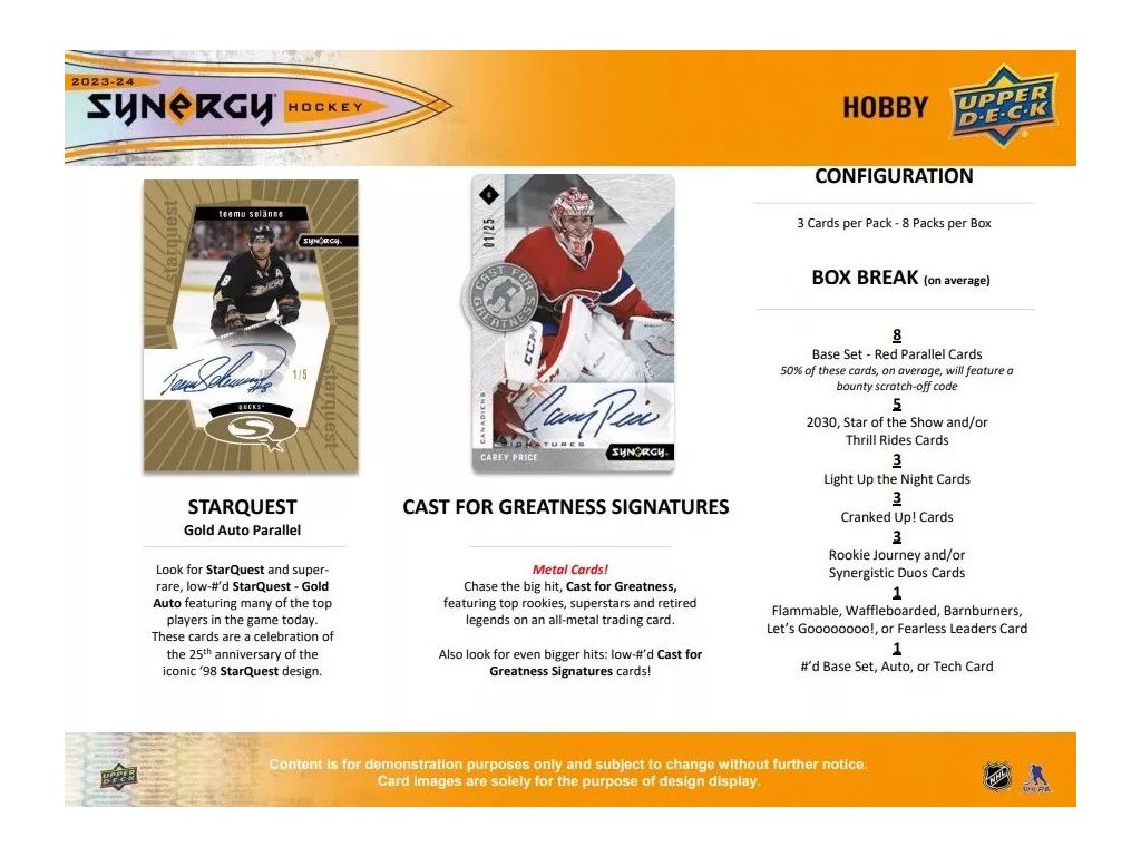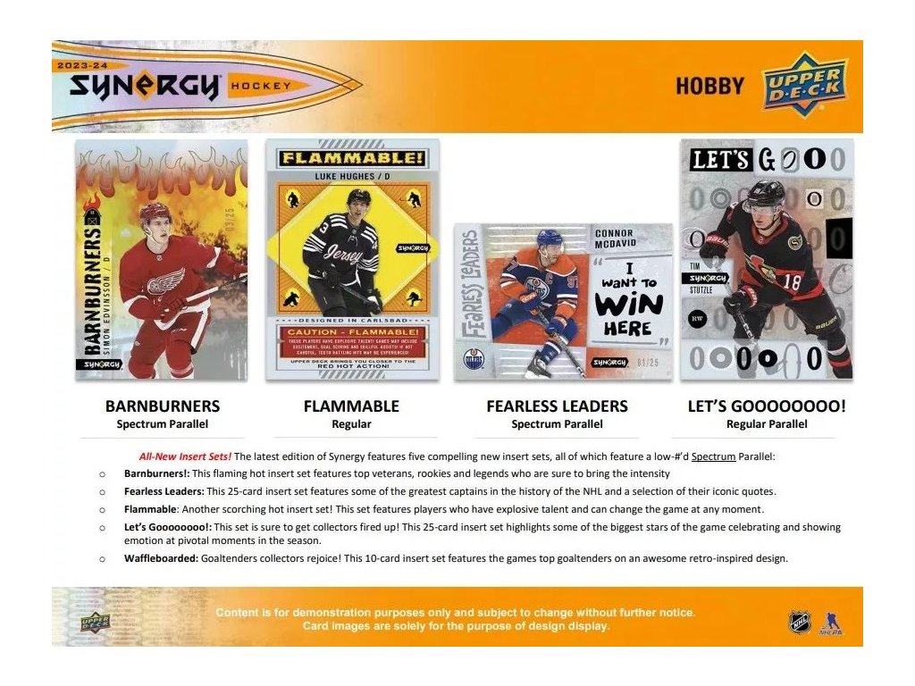 2023-24 Synergy Hockey prináša 125-kartový nízko limitovaný set zložený zo súčasných hráčov (veteráni), legiend a nováčikov (základné a SP).
