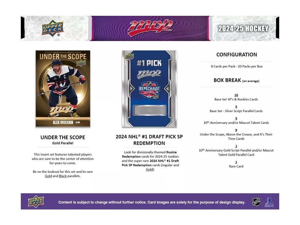 Veľkým lákadlom v sérii MVP sú karty Rookie Redemption a hlavne super raritka 2024 NHL #1 Draft Pick SP Redemption (základná, plus verzia Gold). Na tejto karte by mala byť jednička posledného draftu - MACKLIN CELEBRINI!