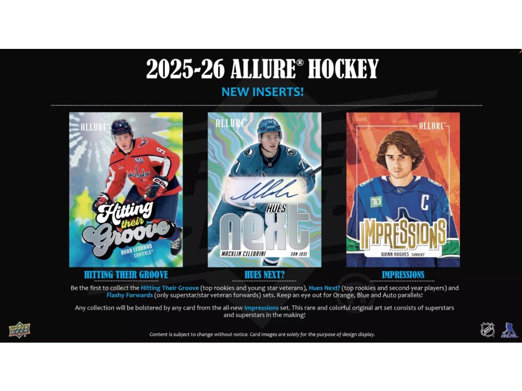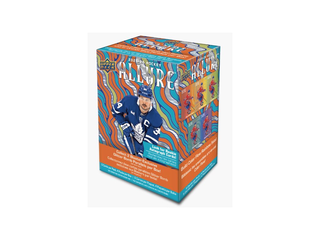 Allure Hockey sa vracia so 150-kartovým základným setom, ktorý obsahuje 100 výrazných súčasných hráčov (Ovechkin, Makar, McDavid... (Demidov, Leonard, Schaefer...) – pričom Rookie karta pripadá v priemere jedna na balíček! Ponuka paralelných kariet je ohromujúca a veľmi rozmanitá, od rôznych farebných a dizajnových variantov až po ich podpísané verzie. Allure Hockey je atraktívny najmä pre zberateľov podpisov, jednotlivých hráčov a kompletných setov. (Draisaitl, Slafkovský, Crosby...) – tie sa vyskytujú v priemere dve na box.