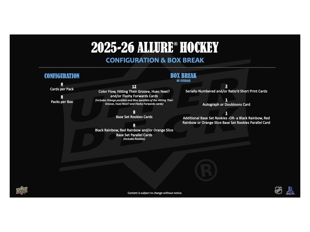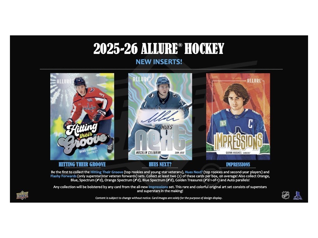 Allure Hockey sa vracia so 150-kartovým základným setom, ktorý obsahuje 100 výrazných súčasných hráčov (Ovechkin, Makar, McDavid...) a 50 špičkových nováčikov (Demidov, Leonard, Schaefer...) – pričom Rookie karta pripadá v priemere jedna na balíček! Ponuka paralelných kariet je ohromujúca a veľmi rozmanitá, od rôznych farebných a dizajnových variantov až po ich podpísané verzie. Allure Hockey je atraktívna najmä pre zberateľov podpisov, jednotlivých hráčov a kompletných setov.