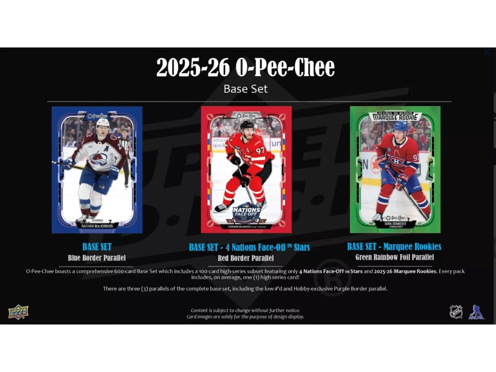 600 kartách, ktorý obsahuje tiež 100-kartový high-series subset tvorený kartami 4 Nations Face-Off Stars (Crosby, MacKinnon, Makar...) a Marquee Rookies (Demidov, Levshunov, Parekh a ďalšie). Pre kompletný základný set sú k dispozícii tri paralelné verzie, vrátane Purple Border (exkluzívne v Hobby) limitované do /49 ks. High-series subset (Face-Off Stars a Marquee Rookie) navyše obsahuje štyri limitované varianty (iba v Hobby):  Foil (/350), Black Rainbow Foil (/100), Green Rainbow Foil (/33) a Gold Rainbow Foil (1-of-1).