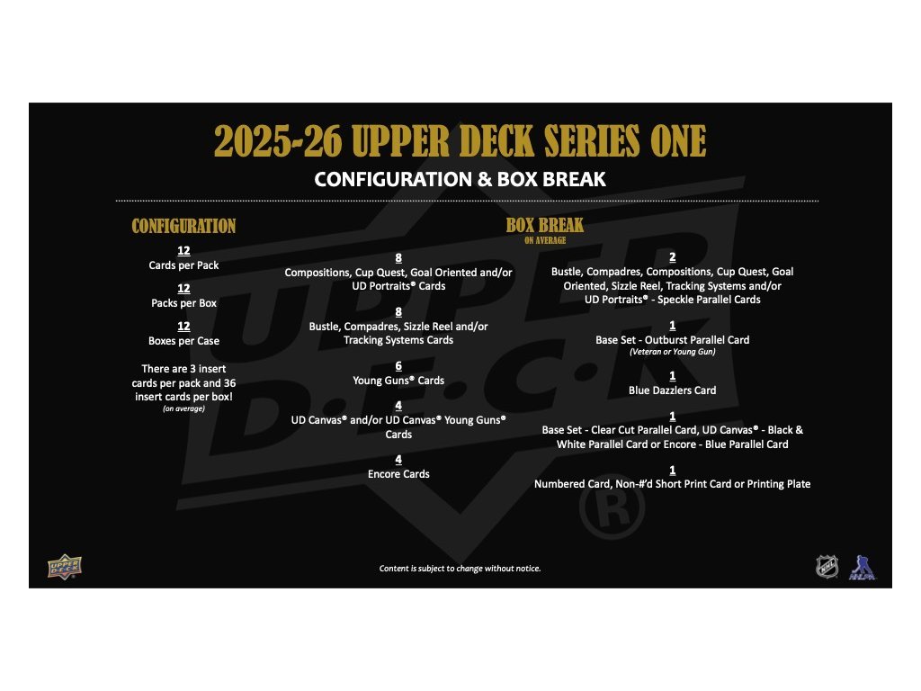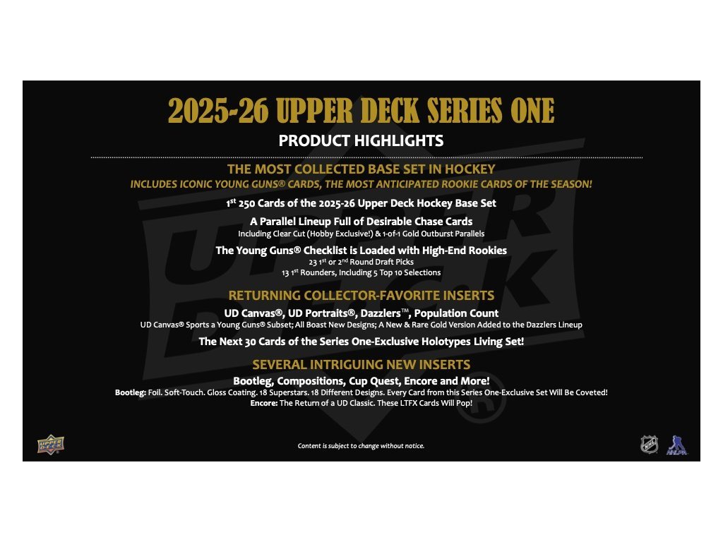 - klasická karta UD Encore sa vracia! Series 1 prináša prvých 100 kariet tejto série s LTFX (fólia so špeciálnym svetelným efektom). Sú zahrnutí aspoň dvaja hráči na tím. Plus paralelná verzia Blue a Gold (/50)!