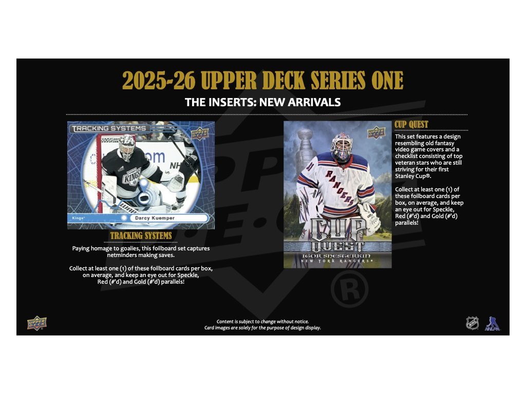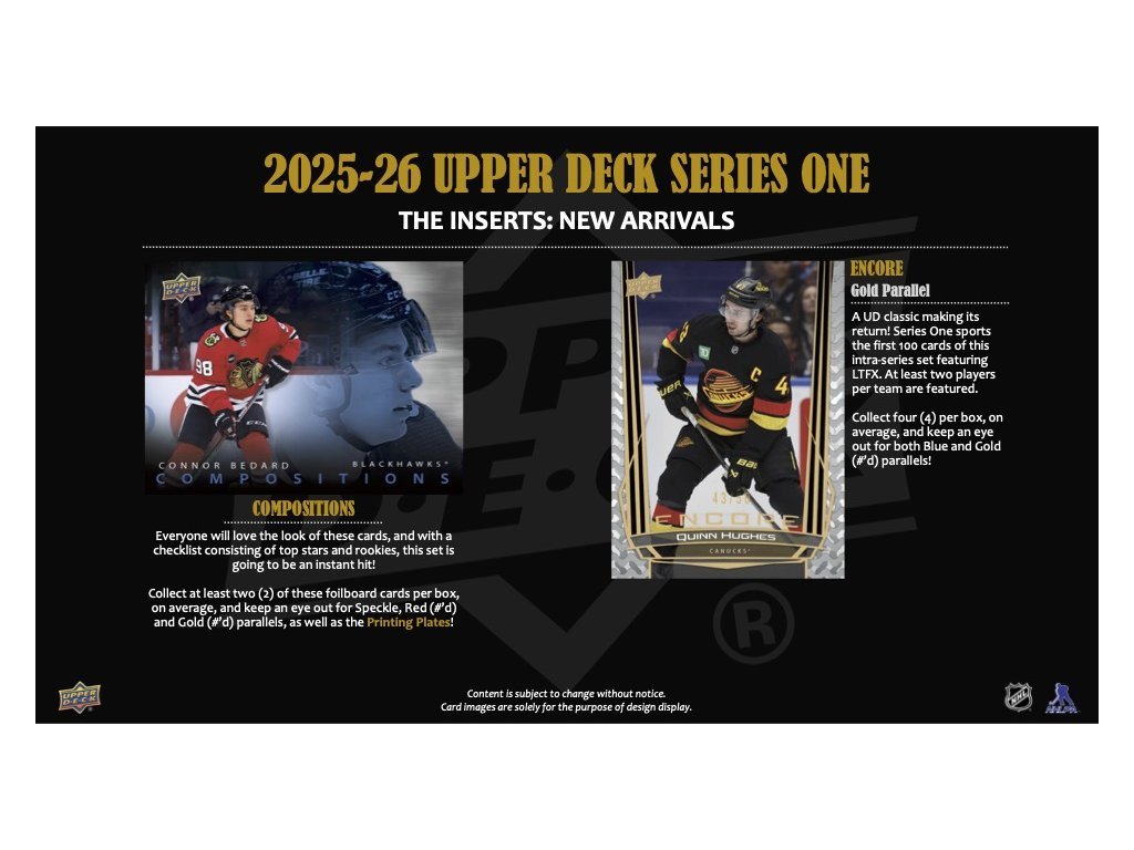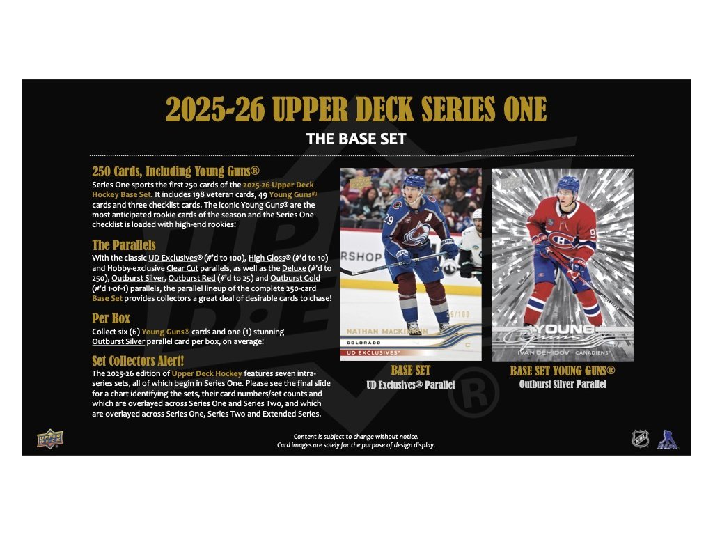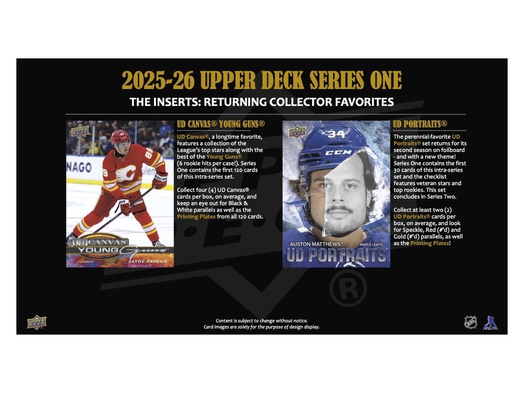 Obľúbené UD Portraits® sa vracia druhýkrát na fóliu – as novými motívmi! Series 1 obsahuje prvých 30 kariet a checklist zahŕňa hviezdy aj top nováčikov (Matthews, Ostlund, Makar, Dvorský...). Zberatelia si môžu skompletizovať celý set 2025–26 UD Portraits® v Series 2.