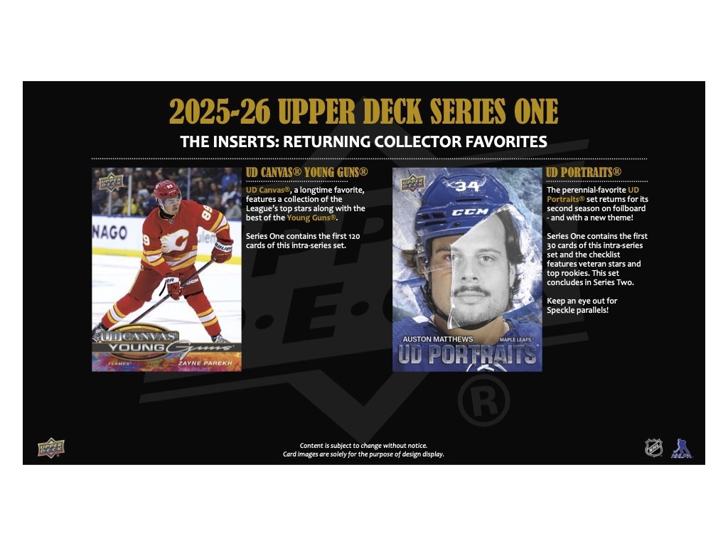 Obľúbené UD Portraits® sa vracia druhýkrát na fóliu – as novými motívmi! Series 1 obsahuje prvých 30 kariet a checklist zahŕňa hviezdy aj top nováčikov (Matthews, Ostlund, Makar, Dvorský...). Zberatelia si môžu skompletizovať celý set 2025–26 UD Portraits® v Series 2.