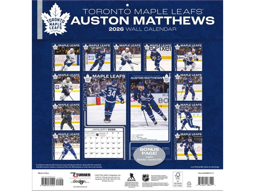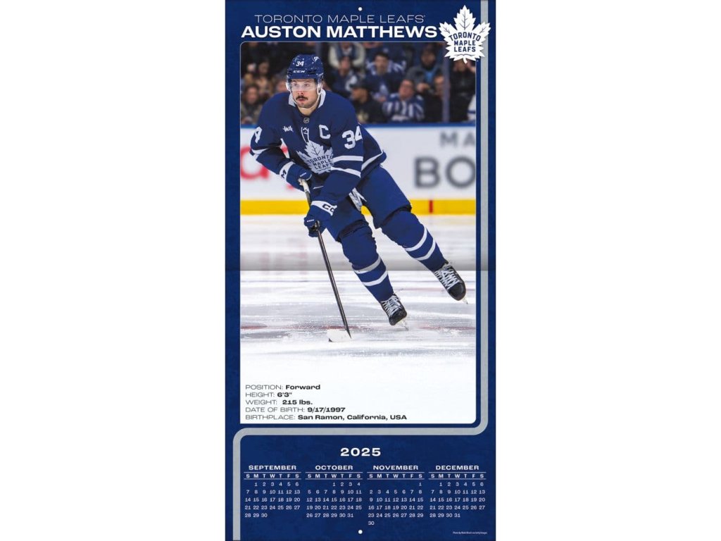 Kalendář Toronto Maple Leafs NHL Auston Matthews #34 2026 Wall Calendar