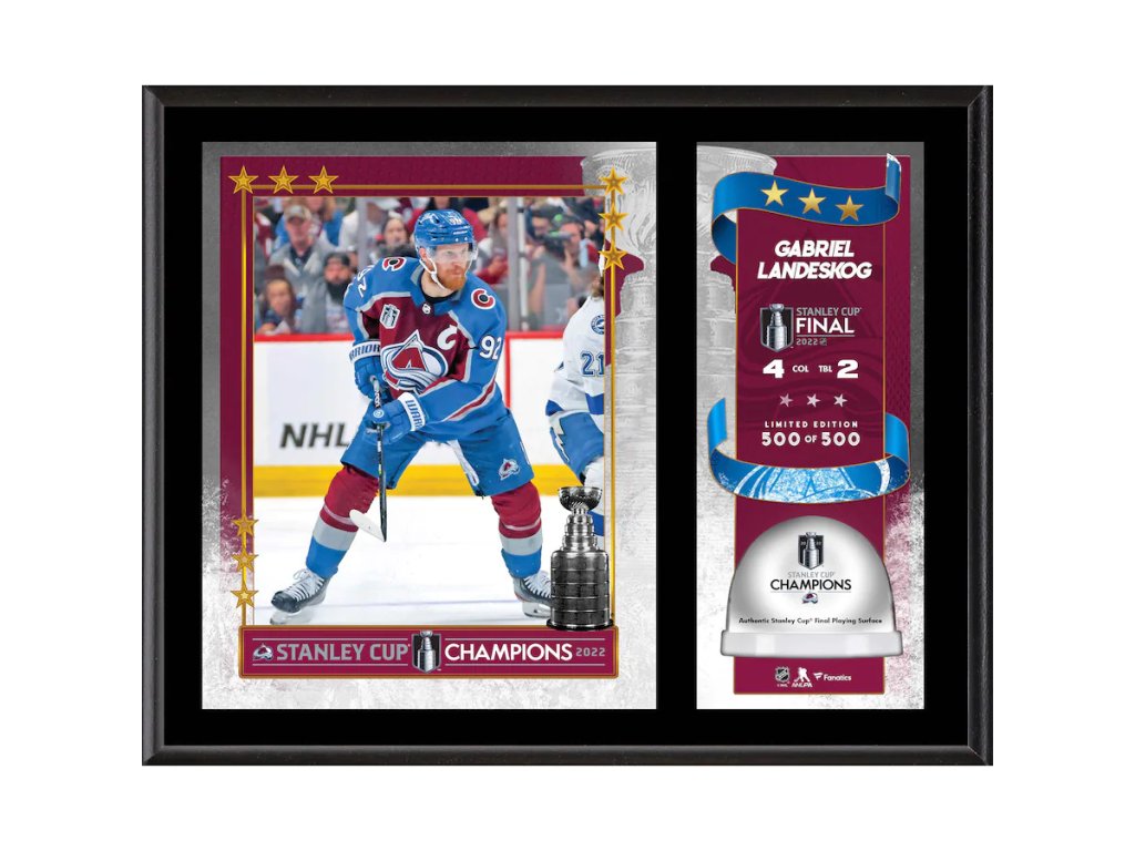 Obraz Colorado Avalanche NHL 2022 Stanley Cup Champions Gabriel Landeskog 12'' x 15'' Sublimated Plaque with Game-Used Ice from the 2022 Stanley Cup Final - Limited Edition of 500