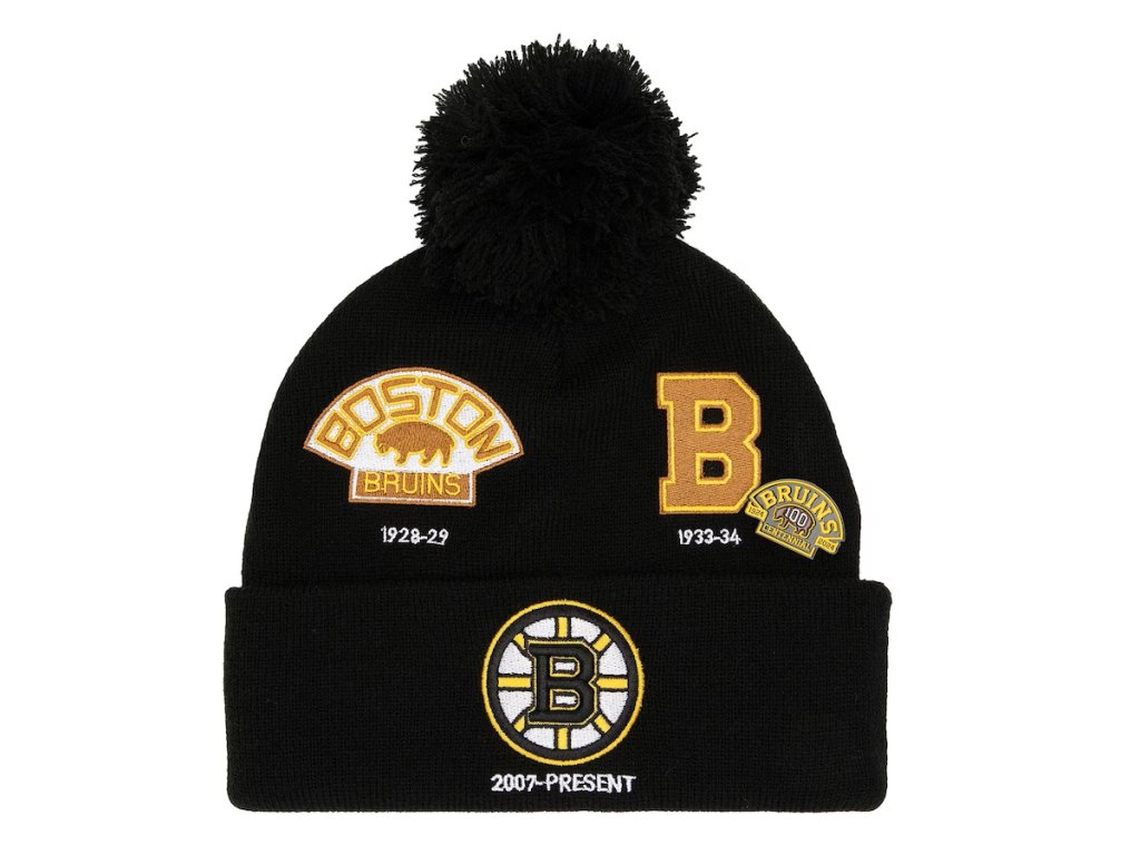 Pánská zimní čepice Boston Bruins NHL 100th Anniversary Collection Timeline Cuffed Knit Hat with Pom - Black/