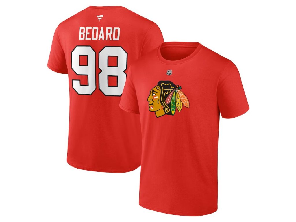 Pánské tričko Connor Bedard #98 Chicago Blackhawks Draft 2023 Stack Logo Name & Number Red