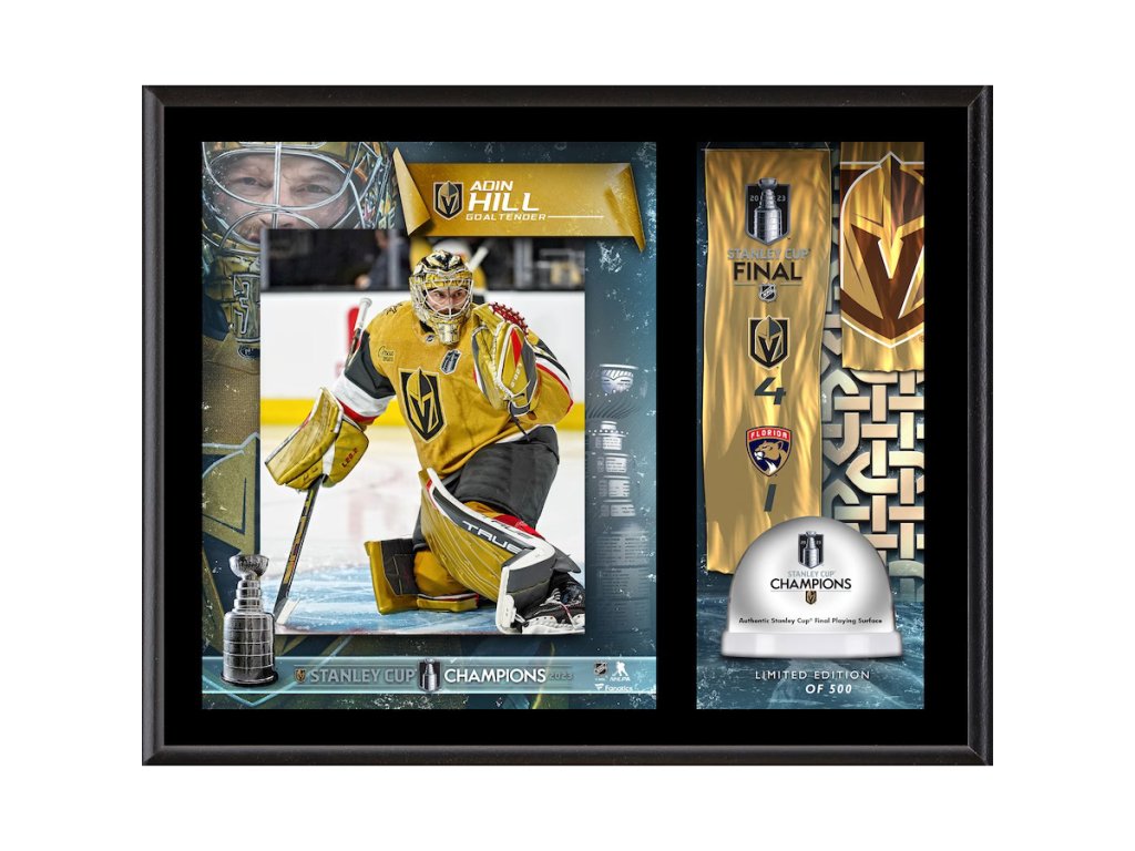 Sběratelská plaketa - koláž Vegas Golden Knights NHL Adin Hill 2023 Stanley Cup Champions 12'' x 15'' Sublimated Plaque with Game-Used Ice from the 2023 Stanley Cup Final - Limited Edition of 500